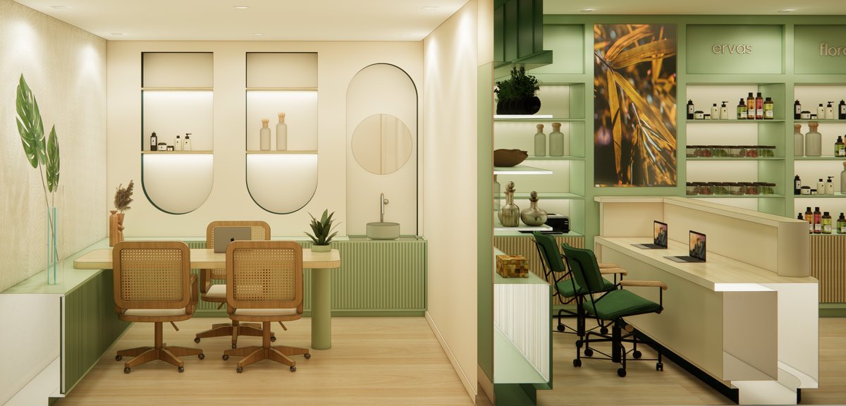 A partir de entrevistas feitas com o cliente, visitas à farmácia atual e da avaliação do material desenvolvido pela empresa de marketing, conseguimos definir um layout perfeito para as atividades desenvolvidas no local. Sobre a estética, entendemos que as cores e logo definidos pelo marketing podiam ser perfeitamente utilizados na arquitetura. Por se tratar de uma filosofia bastante ligada à natureza, principalmente as plantas, decidimos evidenciá-la com as cores, formas e texturas. A fachada é simples, mas bastante elegante. Os ambientes de atendimento ao público também receberam atenção especial e foram projetados com muito cuidado, aliando estética, aconchego e funcionalidade. O cliente também nos contratou para fazer o gerenciamento da obra e compras diretas. Desta maneira, ele não tem nenhuma dor de cabeça nesta fase tão desafiadora do processo.